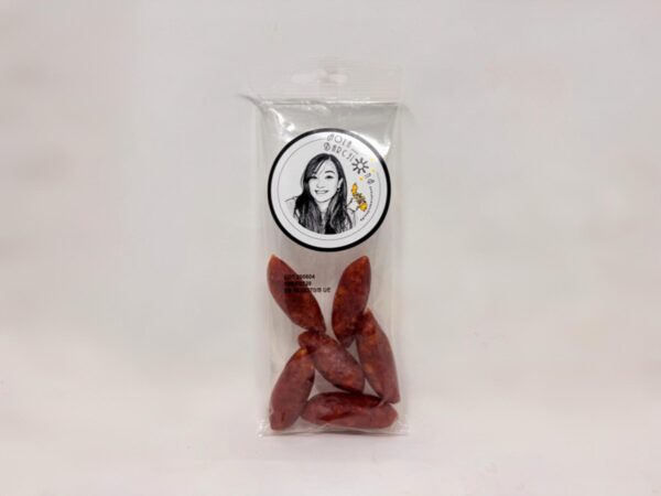 Ingrédients : Viande et graisse de porc, sucre brun, nectar d’ananas (à partir de concentré) (jus d’ananas à partir de concentré, eau, sucre, acidifiant : acide citrique, stabilisants : pectine, vitamine C), ail frais, sel, poivre noir, paprika doux et piquant, épices, dextrine, acidifiants (E262, E331), maltodextrine, antioxydant (E301), arôme, colorant (E120), enveloppe comestible de collagène d’origine bovine.